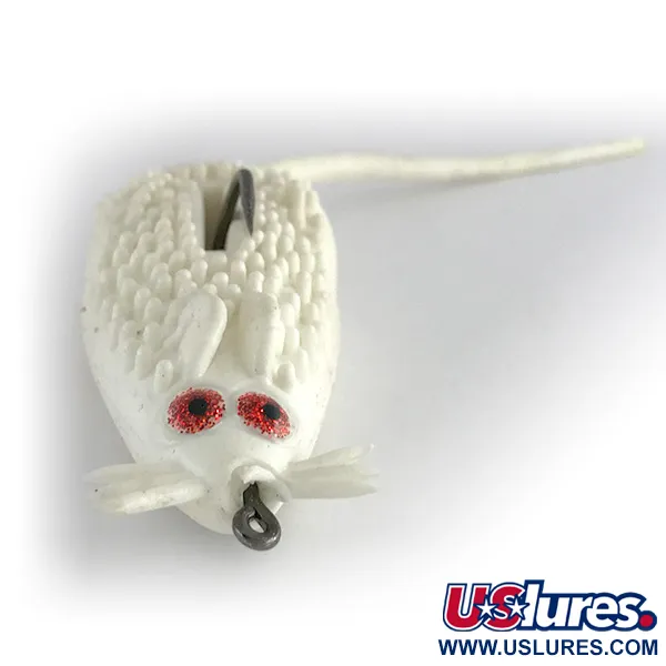 Un acabado blanco nítido cubre el cuerpo texturizado y rugoso de este clásico roedor de superficie, ayudándolo a destacar entre la vegetación espesa. Originario de los EE. UU., este Strike King King Rat, catalogado con el código 8065, representa una era esencial del diseño de superficie anti-enganches para pescar en coberturas densas. El cuerpo blando cuenta con un anzuelo simple orientado hacia arriba, protegido por una ranura profunda a lo largo del lomo para evitar enganches. Sus brillantes ojos rojos proporcionan un objetivo visual claro, mientras que los bigotes integrados y la cola larga añaden realismo a su perfil. Con 1/2oz (14g) y 2 1/4" (6cm), la relación peso-tamaño está equilibrada para lanzar entre los lirios acuáticos donde suelen esconderse lucios y percas. Este espécimen en particular está en excelente estado, con una calificación de 5/5, manteniendo el color blanco y los componentes flexibles notablemente bien conservados. El ojal de sujeción está posicionado directamente en el morro para una recogida recta y constante a través de la maleza.