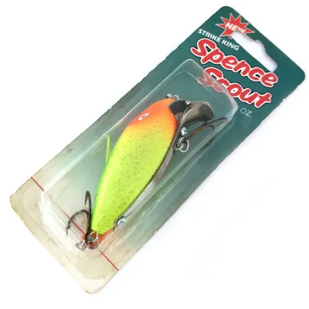 Un vibrante esquema de colores 245-10, que combina un cuerpo amarillo brillante con una cabeza naranja cálida, define el acabado de este Strike King Spence Scout de 10,5 g (3/8 oz). Aún conservado en su blíster vintage original, este ejemplar no ha sido utilizado, preservando el acabado brillante aplicado en fábrica en su cuerpo de 6,5 cm (2 1/2"). El embalaje, marcado con el código de producto 11145, indica que fue fabricado en Costa Rica y cuenta específicamente con anzuelos Eagle Claw Lazer Sharp. Este modelo flotante de tipo sonoro está diseñado para una profundidad de inmersión somera de 0,3-0,9 m (1-3 pies). Un robusto babero metálico está fijado en el morro, asegurado con un clásico enganche de pitón visible a través del plástico transparente.