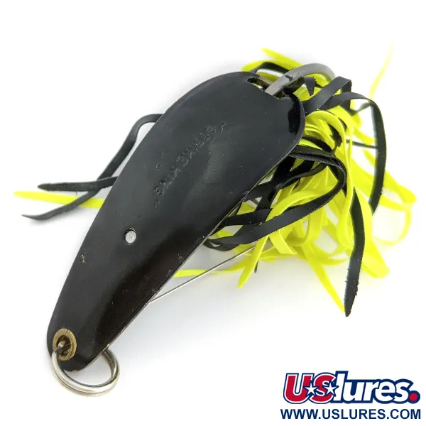 Con un peso de 1/2 oz (14 g), la Strike King Timber King es una cucharilla antialgas clásica que representa un testimonio de la historia de los aparejos de pesca estadounidenses. Con una longitud de 5,5 cm (2 1/4"), este señuelo específico (Código de producto 17998) presenta un acabado en negro profundo en su cuerpo metálico, realzado por un faldón de goma multifilamento en contraste negro y amarillo. Lanzado originalmente en 1979, este modelo fue diseñado para buscar lucios y black bass de gran tamaño en las coberturas de madera más densas, una época en la que la marca se centraba en herramientas especializadas para coberturas pesadas. Su construcción incluye un robusto anzuelo simple protegido por protectores antialgas de alambre integrados, lo que garantiza que pueda navegar a través de vegetación espesa sin engancharse. Este ejemplar se mantiene en un estado de conservación 5/5, conservando una superficie impecable tanto en la cucharilla como en la anilla de sujeción reforzada. Descatalogada hace mucho tiempo, esta rareza fabricada en EE. UU. representa una pieza funcional del patrimonio de la pesca deportiva de finales de los años 70.