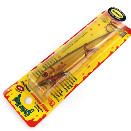 Los acabados dorados como el de este Strike King Wild Shiner se diseñaron para emitir destellos y captar la luz de manera efectiva en diversas condiciones de agua. Este jerkbait de 12 cm (4 3/4") forma parte de la serie signature de Kevin VanDam, bajo el código de producto 9918 e identificado por la etiqueta BBWSS-396 en el reverso. Cuenta con los distintivos anzuelos triples rojos "Bleeding Bait", un detalle técnico destinado a simular una presa herida. Con un peso de 17 g (3/5 oz), el señuelo es un modelo suspending, diseñado para mantener su posición en la columna de agua durante las pausas. En el lance, la profundidad oscila entre 0,3 m y 2 m (1ft a 6.5ft), mientras que en curricán puede alcanzar profundidades de 3 m a 4 m (10ft a 13ft). Este ejemplar está sin usar, conservado en su embalaje original de su fabricación en México. El perfil estilizado y el detallado patrón de escamas se mantienen nítidos e intactos.