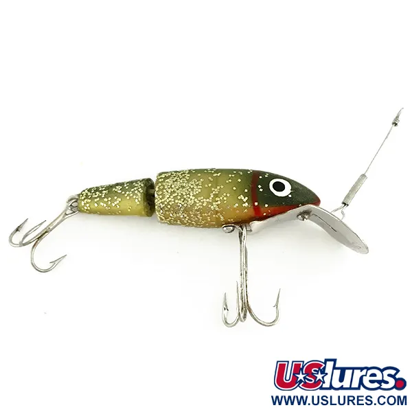 Un acabado Pearl Glitter le da a este señuelo de 6,5 cm (2 1/2") una apariencia llamativa, con destellos dorados sobre un lomo verde oliva oscuro que transiciona hacia un morro con acentos rojos. Este Suick Cisco Kid Jointed, identificado con el código 6903, representa un ejemplar bien conservado de la historia de los aparejos de pesca fabricados en EE. UU. Pesa 9,5 g (1/3 oz) y utiliza un cuerpo articulado de dos segmentos diseñado para ofrecer estabilidad durante el lance o el curricán. El segmento delantero está equipado con un babero de natación metálico clásico y ojos blancos y negros prominentes, mientras que la sección trasera se estrecha hacia el anzuelo final. El equipo incluye dos anzuelos triples y un bajo de línea de acero de fábrica sujeto a la anilla. Con una calificación de estado de 5/5, el señuelo presenta superficies limpias y componentes metálicos brillantes y sin rastro de óxido.