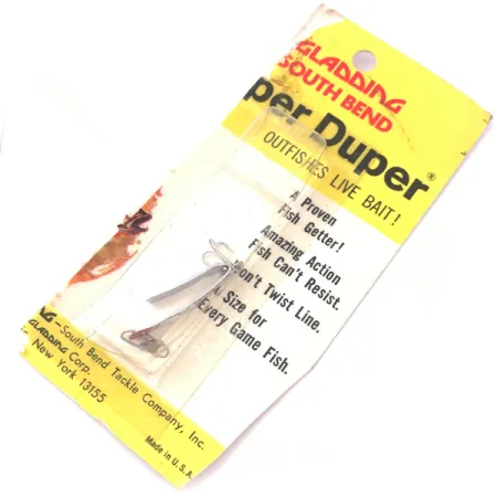 Superficies de níquel pulido acentuadas por una punta roja vibrante definen este South Bend Super-Duper 500 de 2,5 cm (1"), un diminuto señuelo metálico en forma de "U". Con un peso de solo 1,4 g (3/64 oz), este ejemplar permanece sin usar en su embalaje original de la Gladding-South Bend Tackle Company, que lo identifica con el código de producto 3930. Su construcción consiste en una sola pieza de metal doblado diseñada para combinar las características de una cucharilla ondulante y una giratoria. Fabricado en EE. UU., el cartón amarillo vintage presenta gráficos de la época y afirma que "pesca más que el cebo vivo". El hardware incluye un pequeño anzuelo triple montado en la parte trasera del cuerpo curvado, asegurado dentro de la carcasa de plástico transparente original.