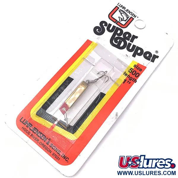 Con una longitud exacta de 1" (2,5 cm), este señuelo metálico es un ejemplo excelente del diseño funcional originario de Hood River, Oregón. El acabado Gold / Red cuenta con un cuerpo chapado en oro pulido con un distintivo detalle en rojo en la cola. Este Super-Duper 500, catalogado con el código de producto 3932, pesa 3/64oz (1,4g) y se mantiene sin usar en su embalaje vintage original. En el reverso del cartón, Luhr Jensen & Sons, Inc. ofrece orientación técnica tanto para lance como para curricán, sugiriendo una recogida de lenta a media. Para el curricán, el fabricante recomienda utilizar un bajo de línea de 18" (45,7 cm) y destaca su eficacia cuando se sitúa a 30-50 pies (9,1-15,2 m) por detrás de la embarcación. El señuelo está equipado con una grapa fijada de fábrica y un anzuelo triple, conservado en su tarjeta expositora original de la época de Luhr Jensen & Sons.