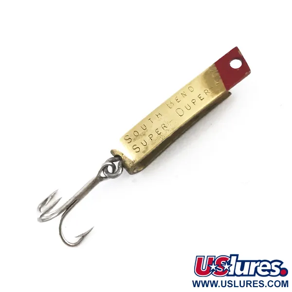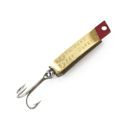 Con un peso de apenas 3/64 oz (1,4 g), esta pequeña cucharilla metálica es una elección clásica ultra-light para la trucha y peces de pequeña talla. El cuerpo de latón con acabado dorado de este Super-Duper 500 presenta el icónico nombre "SOUTH BEND SUPER-DUPER" estampado claramente en el metal. En el enganche de la línea, una distintiva punta pintada de rojo proporciona un fuerte contraste contra la superficie dorada. Al girar el señuelo de 1" (2,5 cm) se revela el número de patente histórico 2719378, lo que sitúa su origen en el diseño americano de mediados de siglo. Este ejemplar, designado con el código de producto 5257, conserva su anzuelo triple de estilo original asegurado por una anilla abierta en la curva en forma de U. El señuelo mantiene una apariencia sólida con una calificación de estado 4/5, mostrando solo ligeros signos de su edad en las superficies metálicas.