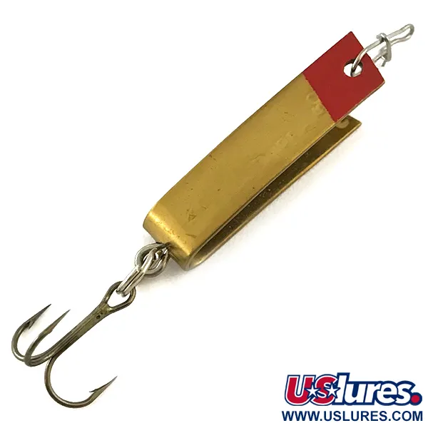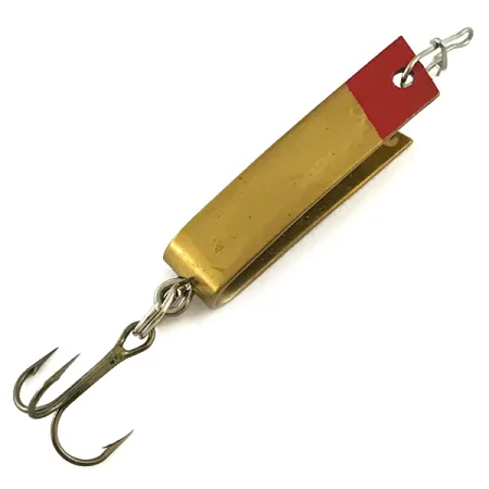 Acentos de pintura roja resaltan la cabeza de este espécimen de 2,3 g (3/32 oz), diferenciándolo de las variantes metálicas sencillas. Este South Bend Super-Duper 501, identificado con el código de producto 6278, presenta un diseño de cuerpo en forma de U que combina las propiedades de una cucharilla ondulante y una giratoria. Con una longitud de 3 cm (1 1/4"), el señuelo está fabricado a partir de una sola tira de metal doblada con un acabado dorado brillante y el nombre del fabricante estampado en el interior. El montaje incluye un anzuelo triple afilado unido mediante una anilla abierta en la curva inferior y una grapa metálica para la conexión de la línea. Fabricado en EE. UU., este señuelo está en condición 5/5, mostrando una superficie limpia y lustrosa con la pintura bien conservada. Esta configuración de color específica es una de las favoritas para quienes buscan un alto contraste durante la pesca finesse de especies depredadoras.