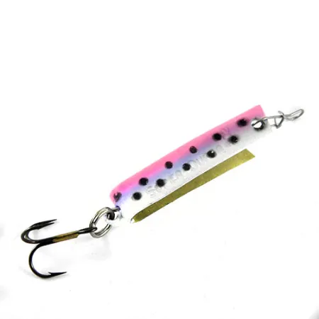 Con un peso exacto de 2,5 g (3/32 oz), esta diminuta cucharilla muestra el distintivo diseño en "forma de U" que hizo famosa a South Bend con el Super-Duper 502. Con el código de producto 1057, el cuerpo de 3 cm (1 1/4") presenta un patrón Trout meticulosamente aplicado que consiste en un degradado de rosa a plateado puntuado por marcadas motas negras. La superficie interior del metal plegado refleja un tono latón cálido, ofreciendo un destello que contrasta con el exterior pintado. Producido en USA, este ejemplar muestra un cuidado excepcional, con una calificación de estado 5/5, herrajes limpios y un acabado brillante. El grabado original permanece nítido en el borde exterior, y el señuelo está equipado con su anzuelo triple y su clip de línea originales de fábrica.