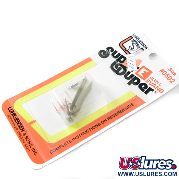 Con una medida exacta de 3 cm (1 1/4"), esta cucharilla vintage Super-Duper se presenta en su blíster original de la época de Glen L. Evans. El acabado en latón se combina con una distintiva cabeza roja, una combinación de colores clásica identificada en la parte posterior como "BRSS/RED HEAD" bajo el número de pedido 1303-502-131. Identificado con el código de producto 1878, este señuelo de 2,5 g (3/32 oz) presenta el icónico cuerpo metálico en forma de U que ha convertido a la línea Luhr Jensen en un elemento esencial para los pescadores de truchas y percas desde que la empresa operaba en Hood River, Oregón. El blíster original incluye un enganche especializado de ojo redondo, cuya importancia para un montaje correcto se subraya en las instrucciones para evitar comprometer la acción del señuelo. Este ejemplar no ha sido utilizado, manteniendo su apariencia de fábrica con una calificación de estado de 6. El diseño del cartón refleja la era de transición en la que Luhr Jensen incorporó la marca Glen L. Evans, manteniendo los altos estándares de los equipos de pesca fabricados en EE. UU. del Noroeste del Pacífico.