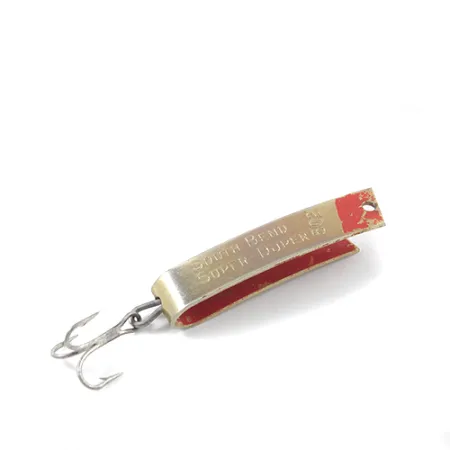 Con el nombre del modelo y "SOUTH BEND" troquelados en el exterior con acabado dorado, este señuelo en forma de U es un clásico reconocible para cualquier coleccionista. Con 3 cm (1 1/4") de longitud y un peso de solo 2,5 g (3/32 oz), fue diseñado para pescar con equipos ligeros. El interior y la punta frontal están acabados en una pintura roja que contrasta con el cuerpo metálico dorado. Identificado con el código de producto 2667, el señuelo lleva el número de patente 2 719 378 estampado en la parte inferior, lo que confirma su origen estadounidense. El estado general es un respetable 4/5, mostrando ligeras marcas de manipulación que resaltan su encanto vintage. Un anzuelo triple estándar permanece unido a la curva trasera mediante un simple anilla abierta.