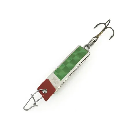 Un distintivo acabado en níquel acentuado por una cabeza roja vibrante y un inserto texturizado verde define la estética de este clásico de South Bend. Con una medida de 3 cm (1 1/4") y un peso de 2,5 g (3/32 oz), el Super-Duper 502 (Código de producto 8620) representa un diseño especializado de metal doblado que captura las cualidades tanto de una cucharilla ondulante como de una giratoria. La superficie superior presenta una cinta verde con patrón de escamas a cuadros que refleja la luz, complementada por una sección roja intensa cerca del enganche para servir como activador visual. Fabricado en los EE. UU., este ejemplar se encuentra en un estado excepcional 5/5, conservando su brillo original y una pintura impecable. Incluye un anzuelo triple de fábrica y un clip de alambre, estando listo para el lance o curricán ligero con equipo ultra-light para truchas y percas.