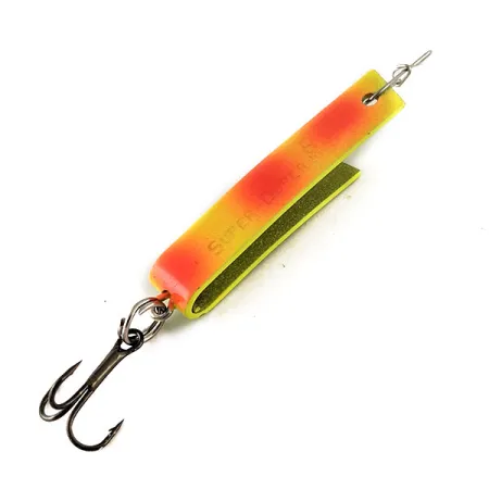 Las propiedades fluorescentes definen al Super-Duper 503 UV, como se aprecia en la vibrante reacción de su acabado chartreuse y rojo-naranja bajo la luz ultravioleta. Con una longitud de 1 1/4" (3 cm), este señuelo compacto de South Bend fabricado en EE. UU. está construido a partir de una sola pieza de metal doblada, una elección de diseño que lo diferencia de las cucharillas tradicionales. El grabado estampado "SUPER-DUPER" es claramente visible en el lateral, resaltando el legado de un modelo que combina las características de un spinner y una cucharilla de lanzado. Con un peso de 1/8 oz (4,3 g), es ideal para técnicas de pesca ligera dirigidas a truchas o percas. El ejemplar se encuentra en excelente estado, con una calificación de 5/5; su acabado original permanece vibrante y los componentes —incluyendo el anzuelo triple trasero y el clip superior— no muestran signos de uso. Este modelo 503 específico, con código de producto 12331, cuenta con un recubrimiento reactivo UV que proporciona una alta visibilidad en aguas profundas o turbias.