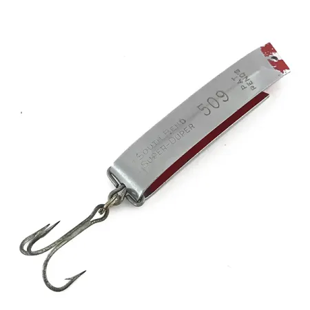 Estampada claramente en el acabado de níquel pulido, la marca 'South Bend SUPER-DUPER 509' identifica este clásico de metal de 5,5 cm (2 1/4"). Esta producción de Luhr Jensen, catalogada bajo el código de producto 8413, presenta el icónico diseño plegado en forma de U que proporciona una silueta distinta para el lanzado o el curricán. El cuerpo exterior presenta una superficie de níquel reflectante, mientras que el interior está acabado en un rojo intenso, creando un perfil visual de alto contraste. Con un peso de 11 g (2/5 oz), el señuelo está equipado con un anzuelo triple afilado sujeto en la base de la curva. En el extremo de la cola, se puede ver el grabado 'PAT. PEND.' junto con el orificio de fábrica para la fijación de la línea. Este espécimen merece una calificación de estado de 5/5, mostrando superficies metálicas bien conservadas y un desgaste de pintura menor y auténtico en el revestimiento interior rojo que resalta su historia vintage.