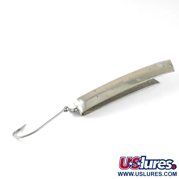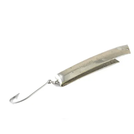 Estampado claramente en la superficie niquelada de este clásico de South Bend se encuentra el número de patente 2.719.378, que lo identifica como un auténtico testimonio de la historia de la pesca de mediados de siglo. Este ejemplar de 3 1/4" (8,5 cm), registrado bajo el código 1721, representa una era fascinante del diseño de señuelos estadounidense donde la sencillez se unía a la eficacia. El modelo Super-Duper 516 está construido a partir de una sola tira de metal doblada, con un acabado en níquel brillante que refleja la luz. Con un peso de 18g (2/3oz), transmite solidez y está equipado con un gran anzuelo simple unido por un robusto anilla abierta. El grabado es notablemente profundo y legible, mostrando «SOUTH BEND SUPER-DUPER 516» en el lateral. En cuanto a su estado, el señuelo tiene una valoración de 4/5, mostrando solo ligeras marcas superficiales de uso y conservando su brillo metálico original. Un único punto de anclaje está perforado con precisión en el borde delantero para la conexión de la línea.