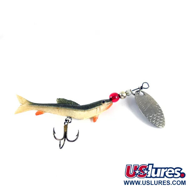 Una hoja de níquel troquelada con la marca 'SWISS SWING 1' define la parte delantera de este señuelo de Renosky Lures, catalogado con el código 1545. Con un peso de 3/32oz (2,5g), el señuelo combina un montaje de cucharilla giratoria tradicional con un cuerpo de vinilo detallado que alcanza las 2 1/4" (6cm) de longitud total. El acabado Nickel proporciona una imitación natural de pez pasto, con un lomo oscuro y un vientre pálido. Una secuencia de cuentas —una roja vibrante y dos metálicas— separa el estribo de la hoja del cuerpo con forma de pez. Para el pescador de equipo ligero, un anzuelo triple está montado directamente bajo el vientre del pez. Este ejemplar está en condición 5/5, manteniendo un acabado muy limpio tanto en sus componentes metálicos como en la textura flexible del cuerpo.