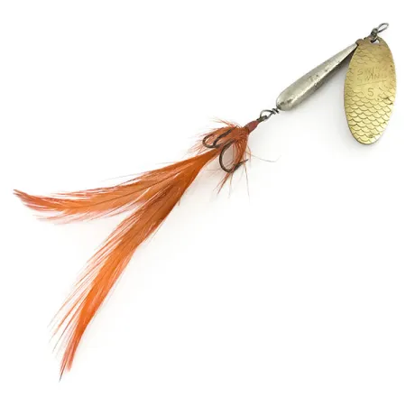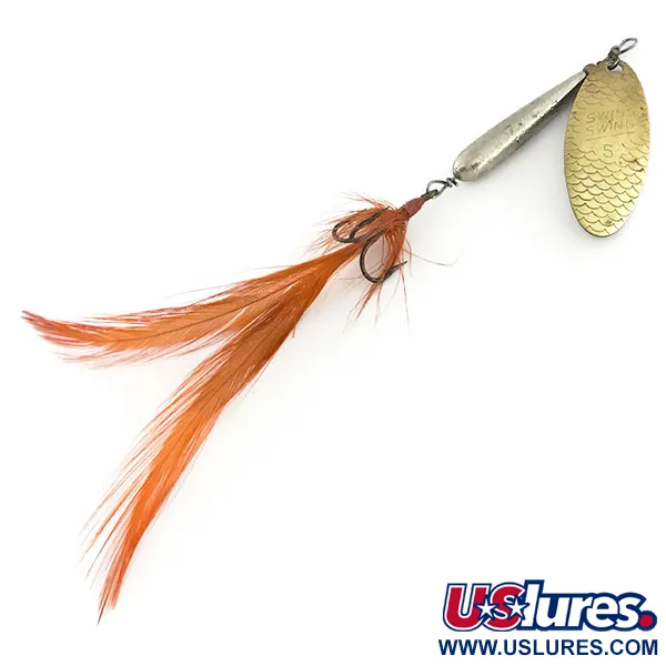 Con una longitud total de 8 cm (3 1/4"), la hoja de latón con patrón de escamas proporciona una textura distintiva que captura la luz de forma diferente a un acabado liso. Una pluma de hackle de color naranja brillante está meticulosamente atada alrededor del anzuelo triple de este ejemplar de fabricación francesa, registrado con el código de producto 9438. El cuerpo de lágrima niquelado proporciona el peso de 9 g (1/3 oz) necesario para un lanzado estable. Renosky Lures trajo estos diseños europeos al mercado, y la hoja está claramente estampada con el identificador 'Swiss Swing 5', mostrando su herencia. Cada componente permanece en excelentes condiciones, con las superficies metálicas y el plumaje muy bien conservados, obteniendo una calificación de 5/5. La construcción del alambre es recta y el estribo permite que la hoja de latón se asiente correctamente contra el cuerpo de níquel.