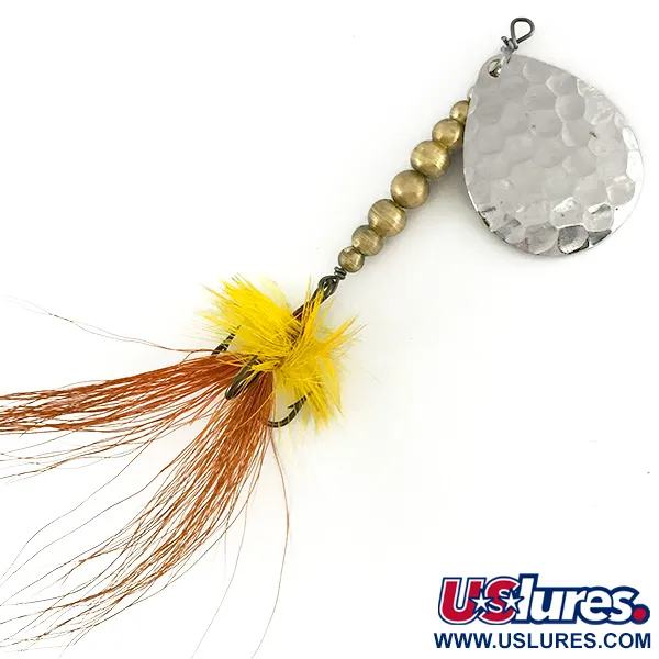 Con una longitud de 7 cm (2 3/4"), la superficie texturizada de la hoja de níquel martillado proporciona un perfil visual distinto en comparación con los acabados pulidos estándar. Esta cucharilla Renosky Lures Swiss Swing Hammered Spoon de 7 g (1/4 oz), identificada con el código de producto 7151, muestra una construcción francesa de alta calidad donde la durabilidad de los componentes es la prioridad. Una serie de cuentas de latón graduadas están dispuestas a lo largo del eje de alambre, proporcionando peso y equilibrio para el lance. La parte posterior está equipada con un anzuelo triple adornado con una combinación de plumas amarillas vibrantes y naranjas quemadas. Este ejemplar está en condición 5/5, mostrando un patrón martillado bien conservado en la hoja en forma de lágrima y el plumaje intacto. El origen francés del herraje es evidente en el ensamblaje preciso del estribo y el lazo de alambre.
