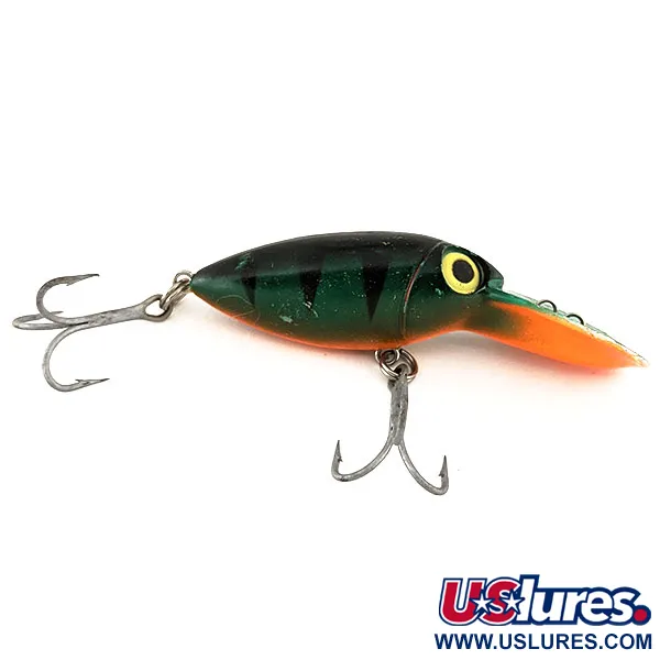 Rayas verticales verdes sobre un lomo oliva oscuro definen el perfil visual de este The Producers Willy's Worm UV, una rareza clásica de fabricación estadounidense. Con un peso de 8 g (1/4 oz), este ejemplar de 5 cm (2") presenta un vientre naranja vibrante que se extiende hacia adelante para formar un babero integrado ancho. Los ojos amarillos con pupilas negras proporcionan un contraste visual distintivo contra la cabeza verde. Catalogado bajo el código de producto 11232, este señuelo destaca por su acabado reactivo a los rayos UV en las rayas, diseñado para captar la luz en diversas condiciones de agua. El hardware consta de dos anzuelos triples en buen estado. La transición de pintura entre la parte superior verde oscuro y la parte inferior naranja brillante permanece nítida, contribuyendo a su calificación de estado 4/5. Cada detalle, desde la forma redondeada del cuerpo hasta la ubicación específica de los ojos, refleja el diseño característico de The Producers.