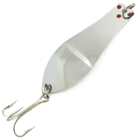 Una nervadura central estampada define el perfil de esta cucharilla de curricán, distinguiéndola de los modelos estándar más gruesos de la gama. Este ejemplar de Prescott Spinner, conocido como Thin Doctor 165 (Código de producto 5682), mide 6,5 cm (2 1/2") y pesa unos ligeros 4 g (1/8 oz). Con un acabado en níquel brillante, el cuerpo metálico presenta tres puntos rojos distintos situados cerca de la anilla abierta superior, lo que proporciona un acento visual localizado contra la superficie reflectante. Fabricado en EE. UU., el señuelo está diseñado específicamente para el curricán, donde se prefiere un perfil metálico más fino. El hardware incluye un anzuelo triple limpio unido mediante una anilla abierta en el borde posterior. En un estado 5/5, el niquelado mantiene un brillo intenso en toda su forma de gota alargada.