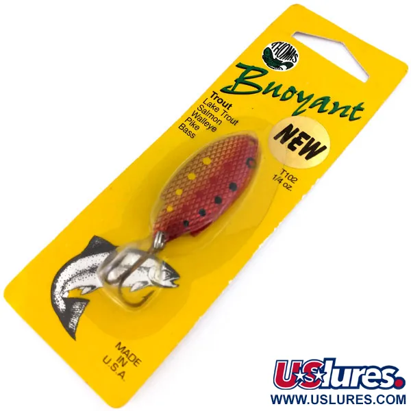 Un vibrante patrón de escamas doradas y rojas define el cuerpo de esta cucharilla ondulante, acentuado por distintos puntos amarillos y negros a lo largo de su superficie curva. Con unas medidas de 1 3/4" (4,5 cm) y un peso de 1/4 oz (7 g), esta Thomas Buoyant permanece sin usar en su blíster original de cartón amarillo, que lleva el código de producto T102GR (también identificado como 10250). Fabricado por Thomas Spinning Lures, Inc. en Hawley, PA, este clásico estadounidense cuenta con un robusto anzuelo triple y una construcción de metal estampado adecuada para el lance o el curricán. El frente del cartón enumera varias especies objetivo, incluyendo truchas, salmones y luciopercas, mientras que una pegatina dorada de 'NEW' destaca su estado vintage impecable. En el reverso, las instrucciones detallan técnicas de pesca en río, como permitir que el señuelo 'aleteé' cerca del fondo para alcanzar la profundidad correcta para varios peces de presa. Este ejemplar conserva su acabado y herrajes originales, ya que nunca ha sido utilizado.