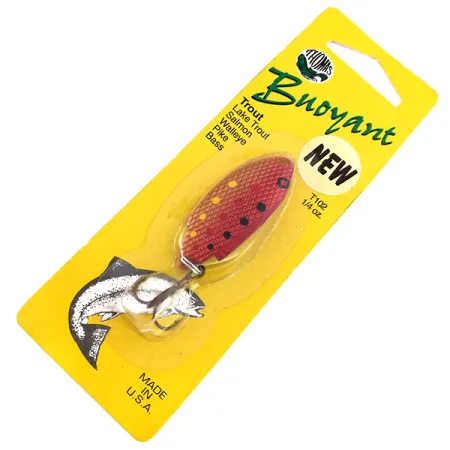 El latón chapado en oro sirve de base para el detallado acabado Red Trout de esta cucharilla ondulante de 7 g (1/4 oz). Sin estrenar y en su blíster original de cartón amarillo, este ejemplar muestra los estándares de fabricación estadounidenses tradicionales de Thomas Spinning Lures, Inc. con sede en Hawley, PA. El patrón consiste en una textura de escamas de color rojo intenso punteada con manchas negras y amarillas, con el fin de imitar la apariencia de una pequeña trucha. Etiquetado bajo el código de producto 10282, el envase también hace referencia al número de artículo T102GR, que denota el esquema de color oro y rojo. Un anzuelo triple de plata brillante está unido mediante un anilla abierta a la cola, manteniéndose tal como salió de fábrica. Los pescadores han utilizado los señuelos Thomas Buoyant durante décadas para capturar especies como salmón, lucioperca y lucio en diversos entornos de ríos y lagos. Las instrucciones detalladas en la parte posterior sugieren lanzar ligeramente río arriba o directamente a través de la corriente para controlar la profundidad durante la recogida.