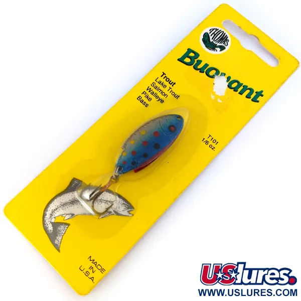 Puntos vibrantes en rojo, amarillo y negro resaltan el acabado Trucha Azul (Blue Trout) de esta cucharilla ondulante de metal de 4 cm (1 1/2"). Esta Thomas Buoyant, identificada con el código de producto 10659, pesa 5 g (3/16 oz) y refleja un legado de diseño que se remonta a la patente de la marca de 1946. La empresa Thomas Spinning Lures, con sede en Hawley, Pensilvania, se centró en un chapado de calidad de joyería para crear un destello de alto contraste. Al ser un ejemplar sin usar, el señuelo conserva su brillo original de fábrica sin signos de desgaste. El montaje incluye un único anzuelo triple y está destinado a diversas técnicas, como el lance para truchas o el curricán para salmones y lucios. Presentado en su tarjeta amarilla original, el señuelo permanece montado sobre la clásica ilustración de la trucha saltando.