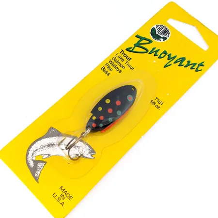 Puntos rojos, amarillos y verdes intensos sobre un esmalte negro profundo definen el patrón Black Trout de esta cucharilla de 4 cm (1 1/2"). Esta Thomas Buoyant, con código de producto T101B, pesa 5 g (3/16 oz) y sigue siendo un básico para pescadores de trucha, salmón y lucioperca. Fabricada en EE. UU., el señuelo tiene un cuerpo metálico de forma única diseñado para lance o cacea en diversas condiciones. El hardware está sujeto mediante una anilla abierta, junto con un anzuelo triple afilado de fábrica. Este ejemplar no ha sido usado, conservando su estado original de fábrica de Pensilvania. El cartón original incluye instrucciones específicas para pesca en río y lago, recomendando una recogida lenta para lograr el movimiento deseado.