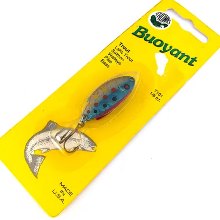 Con un acabado de Trucha Azul y vibrantes puntos rojos y azules, esta cucharilla de 5 g (3/16 oz) es un clásico de la historia del equipo de pesca estadounidense. Con una longitud de 4 cm (1 1/2"), la cucharilla ondulante tiene una forma única de pez pequeño, troquelada con una curvatura distintiva para reflejar la luz. Este ejemplar lleva el código de producto 10661 y se conserva sin usar en su blíster amarillo original. Thomas Spinning Lures patentó este diseño en 1946, y su fama entre los pescadores de trucha y salmón se debe a su acabado de calidad joyería. El reverso del envase destaca su eficacia para especies como el lucioperca y el lucio con una recogida moderadamente lenta. Fabricada en EE. UU., la cucharilla está equipada con un robusto anzuelo triple. Una pegatina de fábrica en la parte posterior identifica la variante T101B-BB, confirmando la paleta de colores plata y azul.
