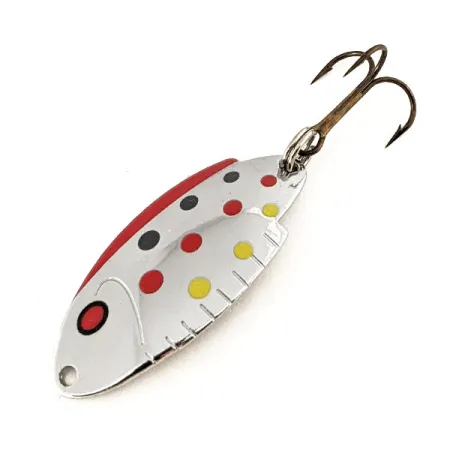 El niquelado sirve como base para un patrón clásico de puntos rojos, negros y amarillos en la cara de este señuelo de 4 cm (1 1/2"). Con un peso de 5 g (3/16 oz), este Thomas Buoyant (código de producto 11248) presenta la forma tradicional de cucharilla que ha definido la pesca de trucha americana durante generaciones. El reverso muestra claramente el nombre del fabricante y el sello 'BUOYANT', profundamente grabado en el metal. Un llamativo detalle rojo sigue la curva exterior, mientras que la cara se detalla con un ojo estilizado. El anzuelo triple y las anillas mantienen su brillo y afilado, reflejando su estado 5/5. Este ejemplar fabricado en EE. UU. conserva su lustre pulido en todo el cuerpo, con una aplicación de pintura nítida y vibrante.