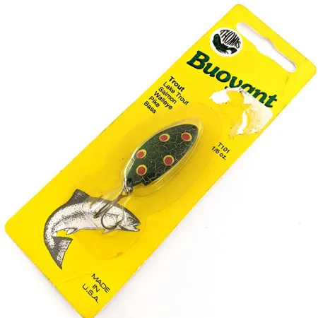 Con una medida exacta de 4 cm (1 1/2"), esta cucharilla ondulante está acabada en el característico esquema de color Red Dot Frog, con una superficie moteada verde oscuro con destellos dorados y vibrantes motas rojas. Este espécimen en particular, identificado con el código de producto T101FRG, permanece en su blíster original amarillo vintage y no ha sido usado. Con un peso de 4,7 g (1/6 oz), el señuelo forma parte de una estirpe que se remonta a una patente estadounidense de 1946. El cuerpo de metal estampado está diseñado para ser eficaz en arroyos o lagos cuando se busca trucha, salmón y lucioperca. Según las instrucciones originales del reverso, se recomienda una recogida de lenta a moderada tanto para lanzado como para curricán. El acabado de calidad de joyería se mantiene brillante, y el cartón original lo cataloga como un producto auténtico fabricado en EE. UU. por Thomas Spinning Lures, Inc. La parte posterior del paquete también incluye recomendaciones específicas de montaje, como el uso de un cierre Duo-lock o un nudo de lazo para permitir que el señuelo alcance la profundidad deseada.