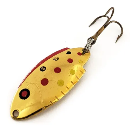 Los patrones de trucha dorada caracterizan a esta clásica cucharilla ondulante americana, que presenta un brillante acabado chapado en oro decorado con puntos rojos, amarillos y negros. Con un peso de 3/16 oz (5 g) y una longitud de 1 1/2" (4 cm), esta Thomas Buoyant es una pieza esencial de la historia del material de pesca estadounidense. El lado convexo está detallado con un borde rojo pintado y pequeñas muescas que imitan las aletas de un pez, lo que aumenta su atractivo visual tanto para coleccionistas como para pescadores. En el reverso, el metal lleva estampado el nombre de la marca Thomas y la designación del modelo T101. Este ejemplar, identificado con el código de producto 11974, mantiene una calificación de estado de 5/5, con el acabado dorado y los detalles pintados excepcionalmente bien conservados. Diseñada para lanzado o curricán, la cucharilla está equipada con un anzuelo triple afilado sujeto mediante una resistente anilla abierta.