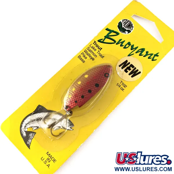 Un peso preciso de 1/4 de onza (7 g) convierte a esta Thomas Buoyant en un señuelo básico para los pescadores de arroyos de montaña que buscan especies como truchas y salmones. Este ejemplar, identificado con el código de producto T102GR, presenta un distintivo acabado martilleado Oro/Rojo que imita la coloración de una trucha, con motas amarillas y negras sobre el metal con patrón de escamas. Fabricado en Hawley, Pensilvania, el señuelo mide 1 3/4" (4,5 cm) y se conserva sin usar en su embalaje original de cartón amarillo brillante. Thomas Spinning Lures diseñó esta forma específica para funcionar como una cucharilla ondulante, imitando el movimiento errático de un pez pasto durante una recogida moderadamente lenta. El equipo incluye un anzuelo triple afilado unido mediante una anilla abierta resistente, y el fabricante recomienda utilizar un clip Duolock o un nudo de lazo para asegurar que el señuelo logre la acción deseada. Este clásico de fabricación estadounidense muestra el número de modelo T102 en la etiqueta frontal y la designación de color en el reverso.