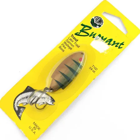 Con una medida exacta de 4,5 cm (1 3/4"), la Thomas Buoyant presenta un patrón clásico de perca con franjas verticales oscuras sobre un fondo dorado latón. Este ejemplar cuenta con el código de producto 22043 y es una pieza sin usar de fabricación estadounidense, conservada en su embalaje original de cartón amarillo. Con un peso de 7 g (1/4 oz), esta cucharilla está fabricada con un acabado de calidad joyería diseñado para reflejar la luz y simular una presa en huida. Un detalle de ojo rojo brillante se ubica cerca de la cabeza redondeada, mientras que el extremo posterior está equipado con un anzuelo triple afilado. Fabricada por Thomas Spinning Lures en Hawley, Pensilvania, la pieza refleja un linaje de diseño patentado por primera vez en 1946. El embalaje destaca su efectividad para especies como trucha, salmón y lucioperca, resaltando la versatilidad de su diseño.
