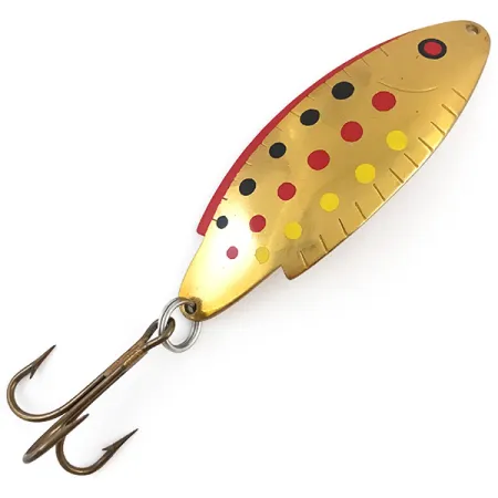 Estampada con la designación de modelo "T105" y "THOMAS BUOYANT" en su lado cóncavo, esta cucharilla representa una pieza clásica de la historia de la pesca estadounidense. El acabado Golden Trout es especialmente llamativo, con una base de oro pulido decorada con filas de puntos rojos, negros y amarillos que imitan el vibrante flanco de una trucha. Con una medida de 8,5 cm (3 1/4") y un peso de 21 g (3/4 oz), este señuelo, identificado con el código de producto 4931, tiene un perfil importante para su tamaño. El cuerpo de latón incluye las características líneas de branquias y aletas grabadas a lo largo del borde posterior, añadiendo detalle textural al destello. Un robusto anzuelo triple está sujeto por una anilla abierta limpia, lo que refleja la durabilidad que se espera de Thomas. En cuanto a su estado, el ejemplar tiene una calificación de 5/5, con un acabado de espejo y aplicaciones de pintura nítidas. Aunque la parte posterior del señuelo indica 5/8 oz, su peso real de 21 g (3/4 oz) lo convierte en una herramienta versátil tanto para el lance a larga distancia como para el curricán.