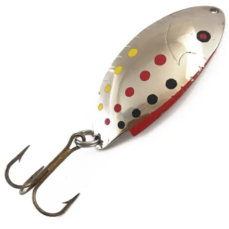 Claramente troquelada en la superficie de níquel pulido del reverso, la marca 'THOMAS BUOYANT 1/2 OZ USA' confirma el legado de esta clásica cucharilla ondulante americana. Con una longitud de 2 1/4" (6 cm) y un peso de 1/2 oz (14 g), este espécimen presenta un distintivo perfil de lágrima con un detalle de aleta en relieve característico de la marca Thomas. El acabado es un niquelado brillante acentuado por un patrón tradicional de puntos rojos, amarillos y negros en el lado convexo, junto con una llamativa aplicación de pintura roja a lo largo de un borde. Este señuelo específico, identificado con el código de producto 4959, conserva su brillo original y muestra una calificación de estado de 5/5. El hardware consta de un robusto anzuelo triple bronceado unido mediante una anilla abierta resistente, adecuada para lance o curricán de especies como la trucha y el salmón. Un pequeño orificio de sujeción está limpiamente perforado en la cabeza cónica, asegurando una conexión segura con el aparejo.