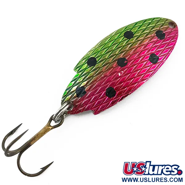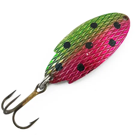 El estampado en el reverso de níquel pulido identifica claramente este ejemplar como el Thomas Buoyant T101, un diseño clásico originario de EE. UU. Con una longitud de 4 cm (1 1/2") y un peso de 5 g (3/16 oz), la cucharilla ondulante presenta una superficie gofrada en diamante que crea un efecto de escamas realista. Esta unidad específica, identificada con el código de producto 5006, muestra el acabado Rainbow Trout con su característico degradado de verde a rosa y marcados puntos negros. Los componentes incluyen una anilla abierta robusta y un anzuelo triple afilado, lo que refleja un estado de conservación 5/5. Los pescadores suelen utilizar este peso para el lance ligero en arroyos o lagos, buscando truchas y otros peces fluviales. El perfil cóncavo del cuerpo metálico está diseñado para desplazar el agua de manera efectiva durante una recuperación constante. Cada detalle, desde la pintura vibrante hasta el grabado nítido en la parte posterior, refleja los estándares de calidad de la Thomas Spinning Lure Company.