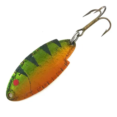 Con un peso de 5g (3/16oz), este ejemplar presenta la clásica forma de cucharilla que ha convertido a los señuelos Thomas en un elemento básico para la pesca de truchas durante décadas. La vibrante pintura Fire Tiger se aplica sobre una superficie texturizada en la parte frontal, pasando del verde al naranja con marcadas franjas verticales y un solo ojo rojo. El reverso tiene un acabado en oro pulido, claramente estampado con el nombre de la marca Thomas, el modelo Buoyant y la designación T101. Con una longitud de 4cm (1 1/2"), su perfil imita con precisión a un pequeño pez pasto, lo que lo convierte en una opción versátil para lanzar en arroyos o lagos. Esta cucharilla fabricada en EE. UU., con el código de producto 5359, se mantiene en condiciones 5/5, con los anzuelos y anillas abiertas excepcionalmente bien cuidados. Su diseño utiliza un cuerpo ligeramente arqueado pensado para el lanzado y recogida en diversos entornos de agua dulce.