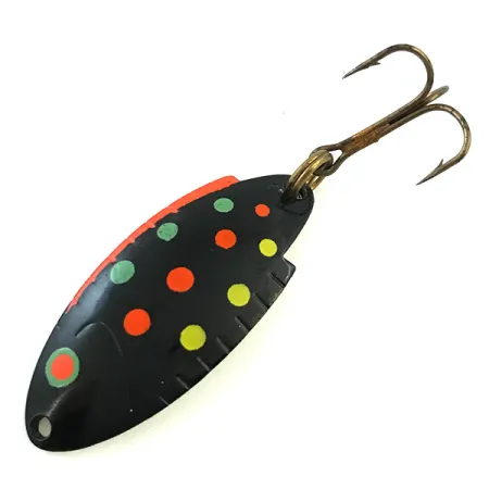 Con un llamativo patrón "Black Trout", la cara de esta cucharilla presenta puntos verdes, naranjas y amarillos sobre una base oscura. Con una longitud de 4 cm (1 1/2") y un peso de 5 g (3/16 oz), este ejemplar catalogado bajo el código 5392 está en excelente estado, con una calificación de 5/5. El reverso revela un fondo amarillo vibrante claramente estampado con el identificador "THOMAS T-101 BUOYANT". El anzuelo triple original con acabado en bronce está sujeto firmemente mediante una anilla abierta robusta en el extremo posterior. Fabricado en los EE. UU., este diseño clásico incluye los característicos bordes muescados destinados a proporcionar un perfil único para el lanzado o curricán en agua dulce. Un pequeño ojal circular está pre-perforado en la parte frontal para facilitar la conexión de la línea o del esmerillón.