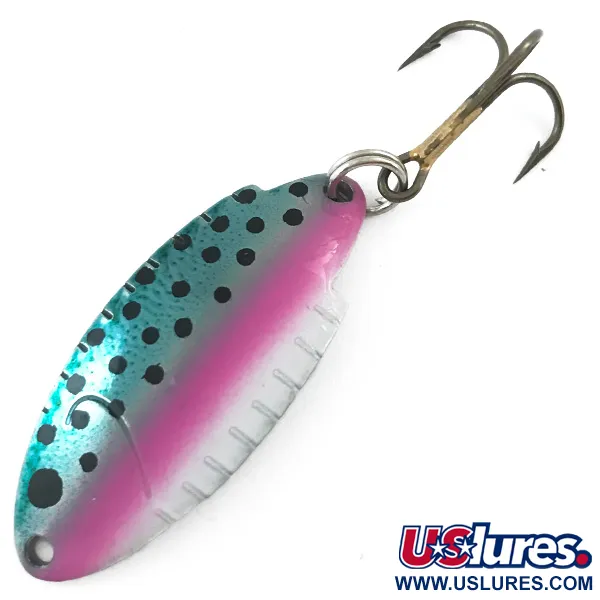 En el reverso de níquel pulido de esta cucharilla de 1 1/2" (4 cm) está claramente grabado el peso de 3/16 oz (5 g). Esta Thomas Buoyant, identificada con el código de producto 5544, presenta una combinación de colores clásica Trucha / Níquel, con la mitad superior en verde azulado metálico y una línea lateral rosa intenso acentuada con puntos negros. El cuerpo de metal estampado incluye las características muescas laterales, un elemento de diseño icónico de la historia de producción de la marca en EE. UU. Un anzuelo triple de bronce afilado está conectado mediante una anilla abierta plateada en la parte posterior. Con una calificación de estado de 5/5, el señuelo presenta un acabado increíblemente bien conservado, y el texto grabado "THOMAS 3/16 OZ BUOYANT" permanece nítido y legible contra la superficie de níquel reflectante.