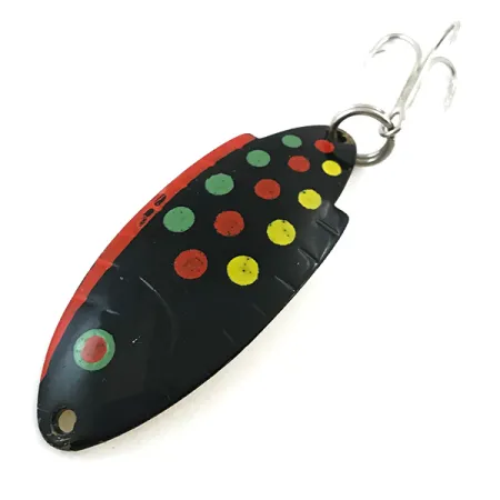 Troquelado en la parte inferior pintada de amarillo, el nombre "THOMAS BUOYANT" permanece nítido y legible en esta cucharilla ondulante de metal de 1 3/4" (4,5 cm). Este ejemplar específico, identificado por el código de producto 5545, luce el icónico patrón Black Trout: un acabado oscuro decorado con una secuencia rítmica de puntos verdes, rojos y amarillos. Con un peso de 1/4 oz (7 g), el señuelo se encuentra en un estado excepcional, con una calificación de 5/5, mostrando una superficie limpia y una pintura bien conservada. Su diseño presenta una ligera curvatura compensada y un detalle de aleta lateral que crea un perfil específico en el agua, un sello distintivo de los señuelos de la empresa Thomas fabricados en EE. UU. El montaje incluye un robusto anclaje de anilla abierta en la parte trasera unido a un anzuelo triple de plata brillante, mientras que un único orificio en la punta sirve como punto de sujeción para el lanzado o la cacea.