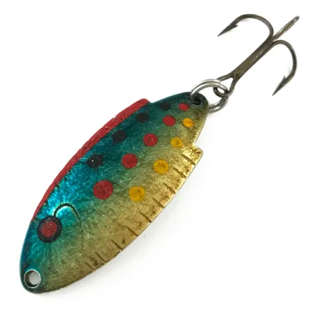 Un vibrante patrón de Trucha Arcoíris se aplica a mano en el lado convexo de esta cucharilla clásica, que presenta un llamativo lomo verde azulado y un cuerpo de color amarillo dorado brillante. Su peso de 1/4oz (7g) la convierte en una opción versátil tanto para lances en arroyos de montaña como para curricán en aguas más profundas. Con una longitud de 1 3/4" (4.5cm), el cuerpo de latón presenta una distintiva cola con muesca y líneas de escamas grabadas profundamente a lo largo del borde inferior. En el reverso, el acabado de níquel pulido permanece excepcionalmente limpio, con la estampación original del modelo Thomas T102 y el nombre "BUOYANT". Este ejemplar, catalogado con el código 5603, tiene una calificación de estado de 5/5, mostrando manchas rojas, amarillas y negras notablemente conservadas sobre la superficie texturizada. El equipo se compone de un resistente anilla partida y un anzuelo triple afilado, reflejo de la calidad de su herencia estadounidense.