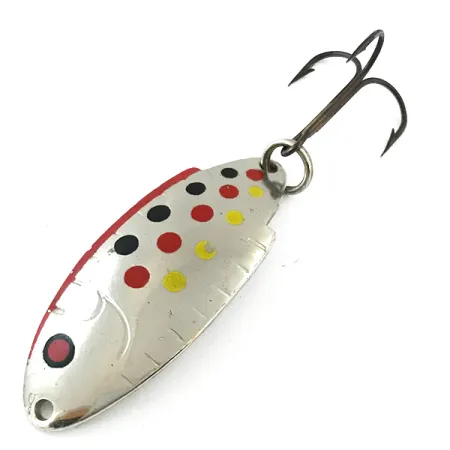 El niquelado proporciona el destello base para el patrón multicolor de puntos rojos, negros y amarillos que decora esta cucharilla de 7 g (1/4 oz). En el reverso, las letras estampadas "THOMAS BUOYANT" permanecen nítidas y legibles contra la superficie pulida, un sello distintivo de la fabricación estadounidense de esta época. Este modelo específico de 4,5 cm (1 3/4"), identificado por el código de producto 5604, presenta bordes con muescas característicos y un lomo pintado de rojo que contrasta con el cuerpo de níquel brillante. El equipo consiste en un robusto anillo de división y un anzuelo triple de acabado oscuro, ambos preservados en excelente forma. Con una calificación de estado de 5/5, el señuelo muestra el acabado multitono vibrante esperado por los coleccionistas. El diseño está destinado al lanzamiento o curricán, con un peso equilibrado específicamente para su flotabilidad característica.