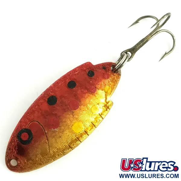 Los tonos dorados combinados con un vibrante patrón de trucha roja definen la estética de esta cucharilla Thomas Buoyant vintage. Con el código de producto 5820, el señuelo mide exactamente 1 1/2" (4 cm) y pesa 3/16 oz (5 g). El acabado es un detallado Golden Rainbow Red Trout, caracterizado por una mitad superior roja intensa acentuada con puntos negros y una mitad inferior dorada texturizada con puntos amarillos. Los herrajes están notablemente limpios, contando con el anzuelo triple y la anilla abierta originales. En el reverso, la superficie de color latón está profundamente estampada con 'THOMAS', 'T101', 'BUOYANT' y una marca de peso de '1/6 oz', una variación común en estas piezas vintage estampadas a mano. El estado es un sólido 5/5, mostrando una pintura preservada y una tipografía clara y legible. Producido por Thomas Spinning Lure Co. en los EE. UU., el cuerpo presenta un sutil patrón de escamas grabado en el metal para mejorar la visibilidad en la columna de agua. Un pequeño detalle de ojo con centro rojo se sitúa cerca del enganche, completando el perfil visual de este clásico del lanzado.