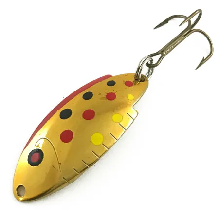 En la parte inferior del metal chapado en oro está claramente estampada la designación "T101", un identificador específico para esta cucharilla Thomas Buoyant de 5 g (3/16 oz). El acabado de este ejemplar es el muy buscado patrón Golden Trout, que muestra una serie de puntos rojos, amarillos y negros sobre una superficie dorada pulida. Con un tamaño de 4 cm (1 1/2"), la cucharilla presenta muescas únicas a lo largo del borde inferior y un detalle de ojo distintivo en el extremo delantero. Este señuelo fabricado en EE. UU., identificado con el código de producto 5821, está equipado con un anzuelo triple de alta calidad unido mediante una anilla abierta resistente. El estado 5/5 es evidente en la claridad preservada de los sellos de fábrica y la integridad de los detalles pintados. Destinado principalmente al lance en agua dulce, el metal de calibre grueso proporciona una densidad significativa en relación con su tamaño.
