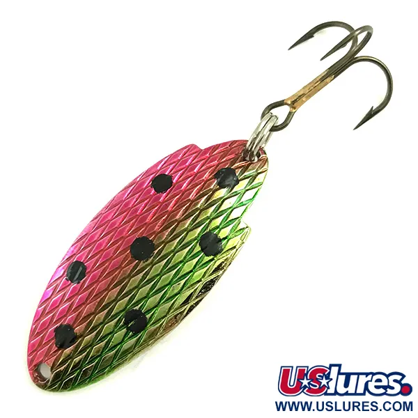 Estampado claramente en el reverso plateado, la designación del modelo T101 identifica a este Thomas Buoyant como una pieza clásica de la historia del material de pesca estadounidense. Con un peso de 3/16 oz (5 g) y una medida de 1 1/2" (4 cm), este ejemplar presenta el distintivo patrón Hammered Rainbow Trout. La paleta de colores en la parte frontal transita de un rosa-magenta intenso a un verde lima brillante, acentuado por seis puntos negros distintos aplicados sobre las facetas en forma de diamante. La parte posterior del señuelo tiene un acabado en plata limpia, con el nombre de la marca Thomas y el peso grabados. Un anzuelo triple con acabado en bronce está unido al cuerpo mediante una resistente anilla abierta plateada. Este señuelo específico, identificado por el código de producto 5823, se encuentra en un estado 5/5, manteniendo un brillo metálico intenso en todas las superficies. Su forma descentrada única es característica de esta serie fabricada en EE. UU., diseñada para el lanzado ligero.