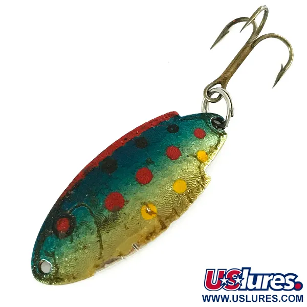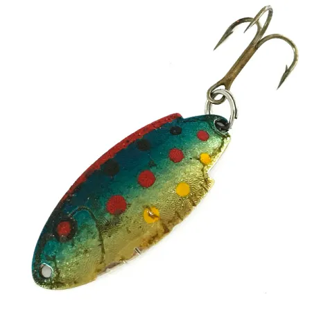 Grabadas claramente en el reverso plateado pulido se encuentran las palabras "THOMAS BUOYANT", que identifican el legado de este señuelo de 4 cm (1 1/2"). Este ejemplar específico, catalogado con el código 7226, luce el acabado Blue Trout, un patrón detallado con un degradado de verde azulado a dorado puntuado por distintos puntos rojos y amarillos. Con un peso de 5 g (3/16 oz), la cucharilla representa la construcción clásica de aparejos fabricados en EE. UU. El hardware consta de un anzuelo triple con acabado bronce y una resistente anilla abierta de metal. Manteniendo una calificación de estado de 5/5, la pintura permanece excepcionalmente brillante y los detalles técnicos grabados en la parte posterior de metal son perfectamente legibles. Una fina línea de pintura roja recorre el borde superior de la cucharilla, proporcionando un fuerte contraste con los tonos azules y verdes del cuerpo principal.
