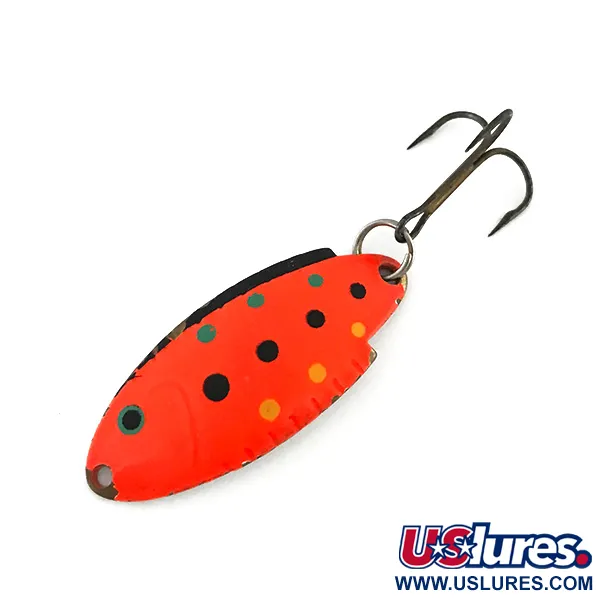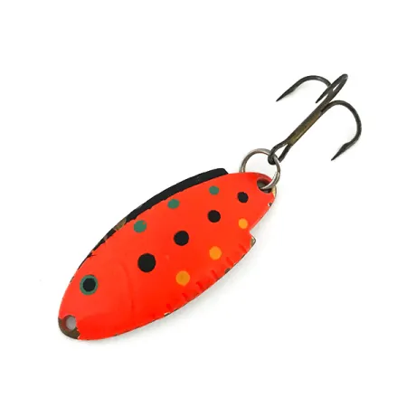 Con un peso de 5 g (3/16 oz), esta cucharilla clásica presenta un patrón Red Trout sobre una base de níquel. El cuerpo metálico de 4 cm (1 1/2") tiene un acabado en rojo anaranjado vibrante, resaltado por puntos negros, amarillos y verdes que proporcionan un perfil de alto contraste. Al exponerse a la luz UV, el acabado emite un fuerte brillo naranja, un detalle técnico diseñado para la pesca en aguas tomadas o de baja visibilidad. Identificada con el código 8550, esta Thomas Buoyant es un ejemplo excelente de fabricación estadounidense, con el reverso de níquel estampado y un anzuelo triple resistente sujeto mediante una anilla abierta. La pintura y los componentes están excepcionalmente bien conservados (estado 5/5). Este espécimen destaca las técnicas tradicionales de fabricación para el lance y curricán de truchas en aguas americanas.