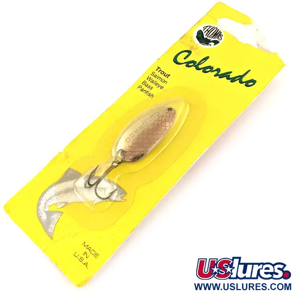 Los tonos dorados y níquel dominan el acabado de esta cucharilla de 5g (3/16oz), que presenta un patrón de escamas troquelado en la superficie metálica. Con una longitud de 3,2cm (1 1/4"), este modelo Thomas Colorado (Código: 11695) refleja la artesanía funcional y directa de los aparejos de fabricación estadounidense. La cara de la cucharilla tiene grabado el nombre 'COLORADO', un diseño utilizado tradicionalmente para el lanzado o curricán de especies como trucha, salmón y lucioperca americana. Este ejemplar está sin usar, conservado en su blíster amarillo original que muestra el logotipo vintage de Thomas. El montaje incluye un anzuelo triple resistente sujeto mediante una anilla abierta, mostrando las líneas limpias del ensamblaje de fábrica. Una ilustración de una trucha saltando y la impresión 'MADE IN U.S.A.' en el cartón realzan el carácter histórico de este hallazgo de mediados de siglo.