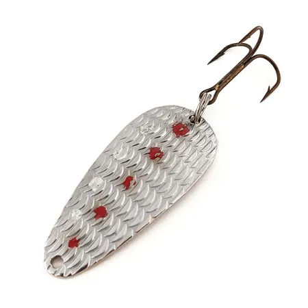 Las escamas de níquel martillado captan la luz en la cara texturizada de esta clásica cucharilla ondulante de fabricación estadounidense. Con una medida de 4,5 cm y un peso de 7 g, el cuerpo metálico presenta varios acentos rojos aplicados a mano dentro del patrón de escamas para proporcionar un contraste visual clásico. En el reverso cóncavo, un estampado claro identifica la pieza como 'THOMAS 1/4 OZ S515 CYCLONE', que coincide con el código de producto 13131. El equipo consta de un robusto anilla abierta y un anzuelo triple bronceado, ambos conservados en excelentes condiciones. Con una calificación de 5/5, la superficie reflectante permanece brillante y clara, mostrando la calidad artesanal típica de Thomas Spinning Lures de los EE. UU. Un único orificio de fijación está perforado en el extremo estrecho para una conexión segura a la línea o a un esmerillón.