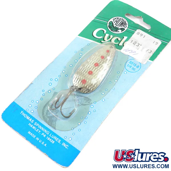 Decorada con un distintivo patrón Golden Trout, la superficie de esta cucharilla vintage presenta vibrantes motas rojas y blancas sobre un acabado metálico texturizado y altamente reflectante. Con una longitud de 4,5 cm (1 3/4") y un peso de 7 g (1/4 oz), la Thomas Cyclone 1891 es un ejemplar sin usar en su blíster original de fábrica. Fabricado por Thomas Spinning Lures, Inc. en Hawley, Pensilvania, este señuelo hecho en EE. UU. destaca por su característico cuerpo con hoyuelos, diseñado para destellar durante una recogida constante. El montaje incluye un robusto anzuelo triple, aún afilado y libre de cualquier desgaste por el paso del tiempo. Identificado con el código de producto 1891, el señuelo permanece en su clásico blíster de burbujas en tonos azul y verde azulado, que también indica la designación S515-B. Cada aspecto de la pintura y el baño metálico de esta cucharilla de 7 g (1/4 oz) se mantiene tan impecable como el día que salió de la fábrica de Hawley.