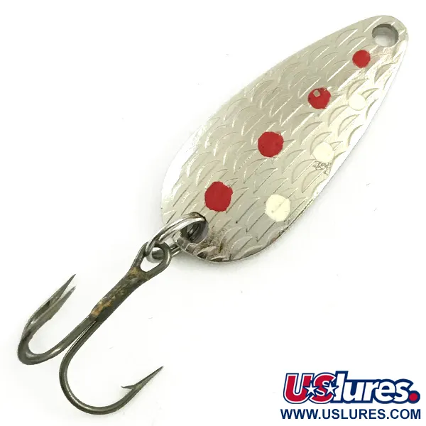 En el reverso de la cucharilla están estampados el nombre del fabricante y la denominación del modelo, lo que confirma su origen estadounidense. Con una longitud de 3 cm (1 1/4"), la Thomas Cyclone pesa 4,3 g (1/8 oz) y presenta un perfil clásico de lágrima. El frontal con acabado plateado está profundamente grabado con un patrón de escamas y decorado con distintos puntos rojos y blancos. Identificado con el código de producto 5818, este ejemplar viene montado con un único anzuelo triple de metal. Dada su calificación de estado 5/5, la cucharilla mantiene una superficie limpia y reflectante con detalles pintados nítidos en todo el cuerpo texturizado.
