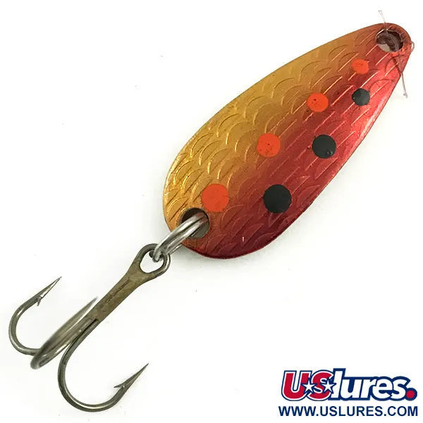 Las texturas de escamas en relieve en el lado convexo proporcionan una superficie táctil única para esta cucharilla ondulante de 3 cm (1 1/4"). Con un acabado en patrón Rainbow Red Trout / Gold, el señuelo muestra una base dorada que transiciona hacia un rojo vibrante, salpicado por puntos naranjas y negros alternos. Esta Thomas Cyclone, catalogada con el código de producto 5819, está fabricada a partir de un cuerpo de latón que presenta el nombre del fabricante y la inscripción "S514" estampados en el reverso junto con la marca "1/6 oz", aunque el peso oficial es de 1/8 oz (4,3 g). Fabricada en EE. UU., esta unidad viene equipada con un anzuelo triple duradero sujeto por una anilla abierta de alta resistencia. Su estado está calificado como 5/5, mostrando un acabado de fábrica limpio sin evidencia de uso en el agua ni oxidación. Un punto de enganche adicional en la cabeza se deja abierto para un nudo directo o el uso de un clip, algo habitual en señuelos diseñados para lances de precisión.